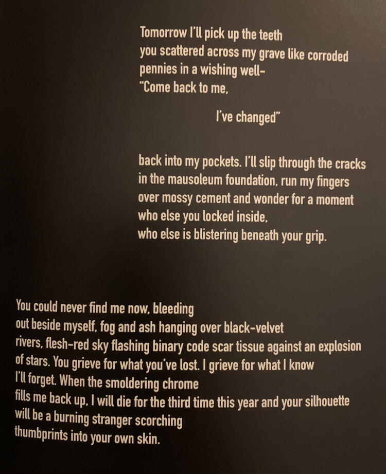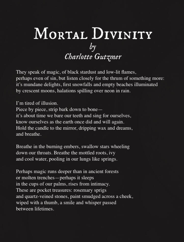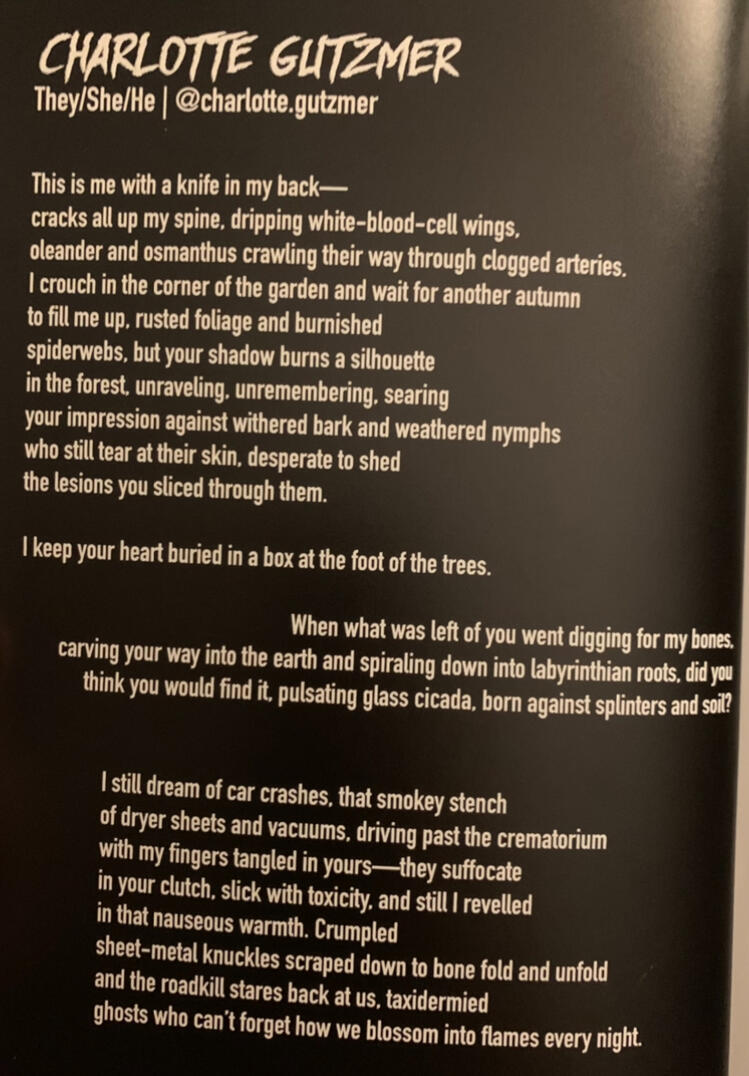 Charlotte Gutzmer (they/she/he) is a nonbinary 22-year old undergraduate writer fascinated with all things magical and bizarre. In their craft, they explore themes of fantasy, identity, environment, and myths—they especially adore creating uncanny worlds that explore surrealism, obscurity, and realms just beyond our reach.Charlotte is also the current Editor-In-Chief for the UWEC student-run magazine The Flipside, as well as the Poetry Editor for UWEC's Fine Arts and Literary journal NOTA.